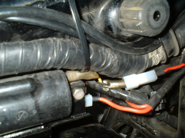 The fatter wire from the battery goes to the front of the bike and under the fuel tank, where the coils live. I've done all connexions with travelling in mind: like every year I ride a lot of kilometres for Europe, in case of a relay breakdown I simply disconnect the relay wires on the OE connexions and re-connect the OE clamps.