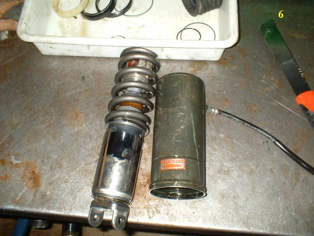 Picture 2: as the Honda workshop manual describe, the shock is settled in a hydraulic press to extract all the oil and the oil seal. The pressure blow up the upper carcass oil seal, splashing oil all around, even when the press is a manual type and I went slowly. Previously to extract the oil ring, there are a metallic circlip and a metallic washer that hold everything in position that must be extracted.