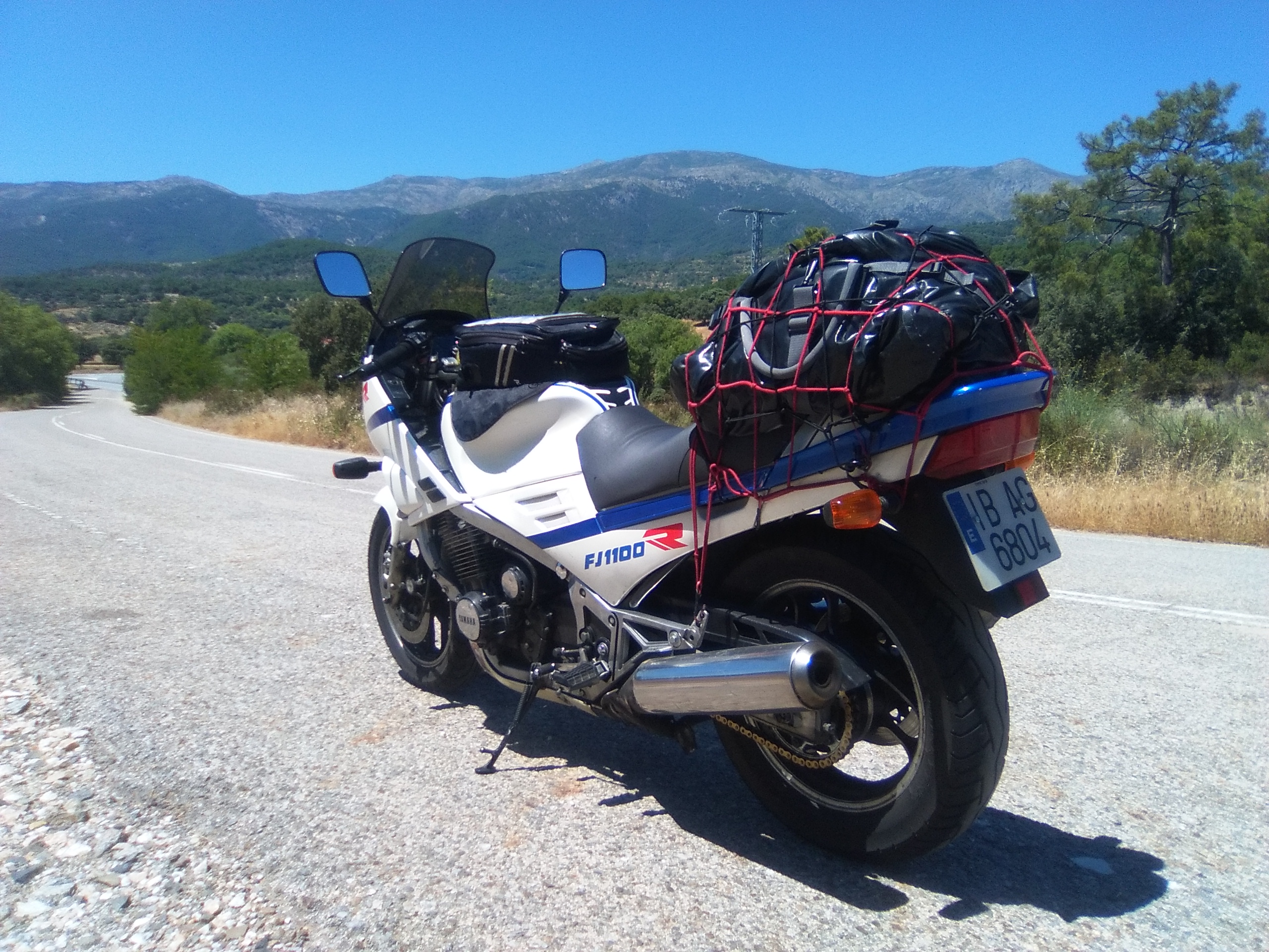 ¿Ves en la foto esa bolsa de basura en mi 1100 atada con la red? Bueno, pues es una enorme bolsa de viaje Hein Gerike. Es estupenda y caben montones de cosas. Y totalmente impermeable. ¡RECOMENDADA!. Miles de kms y años y luce aún en perfecto estado.