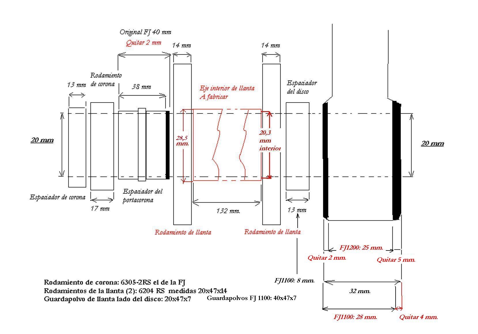 La corona de la FJ entra directa, así como debe conservarse el tirante del soporte de freno de la FJ. El eje de la FJ se usa con la nueva llanta, y los rodamientos de ésta no es necesario cambiarlos (a menos que estén mal, claro)
